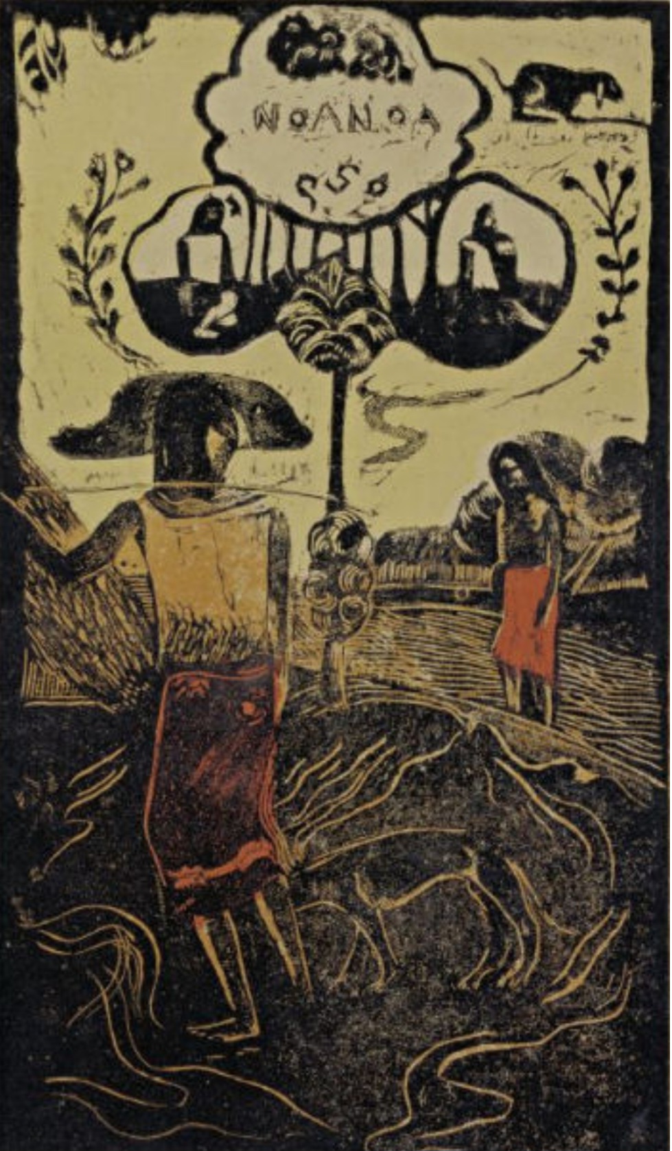 #폴고갱 PAUL GAUGUIN. Noa Noa (Fragrant, Fragrant).1895. Woodcut printed in yellow, yellow-brown, red and black by Louis Roy. Height: 35.60 mm (1.40 in); Width: 20.50 mm (0.80 in).